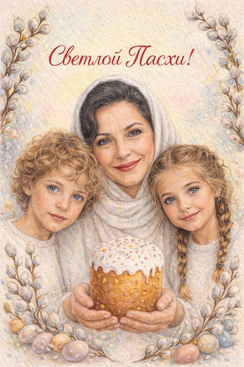 Композиция:бабушка повернута к зрителю с тёплой улыбкой, рядом внуки с мягкими чертами лица. Бабушка в тонком лёгком белом платке,внуки в белых свитерах.В руках пасхальный кулич.Фон:светлый пастельный, мягкое свечение.По краям веточки вербы и маленькие пасхальные яйца.Текст сверху:«Светлой Пасхи!».