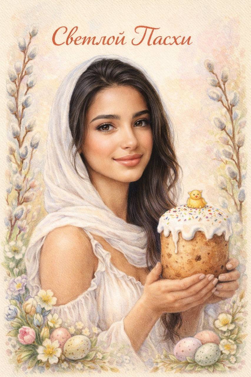Композиция:девушка повернута к зрителю с тёплой улыбкой.На ней белое шифоновое платье.Тонкий лёгкий белый платок свободно накинут вокруг головы и шеи, не закрывает причёску.В руках праздничный кулич.Фон:светлый пастельный, мягкое свечение.По краям веточки вербы, весенние цветы и маленькие пасхальные яйца.Текст сверху:«Светлой Пасхи».