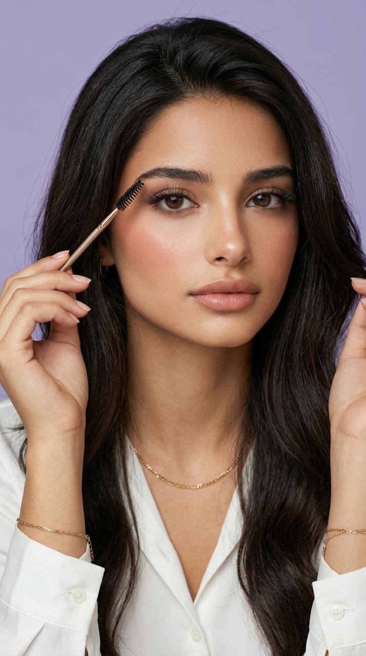 В правой руке она держит щетку для расчесывания ресниц и аккуратно подносит его к лицу. Основной акцент на глазах: длинные, густые, идеально разделённые ресницы, эффект профессионального ламинирования или наращивания.