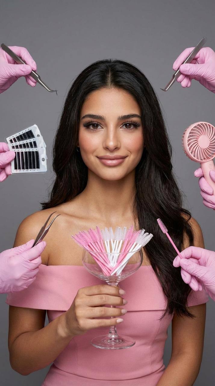 По бокам вокруг неё видны несколько рук в розовых нитриловых перчатках, которые держат профессиональные инструменты для наращивания ресниц: