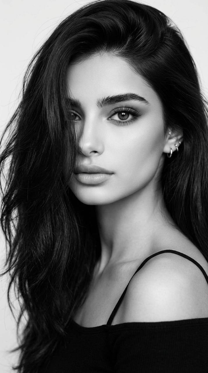 Фон минималистичный: белая стена и гладкий светло-серый пол, без мебели и лишних предметов. Освещение мягкое, рассеянное, студийное или как естественный мягкий дневной свет в чистом интерьерном пространстве, без жестких теней, с аккуратной натуральной цветопередачей. Атмосфера кадра — современная fashion editorial съемка, расслабленная, стильная, слегка дерзкая. Фотореализм, натуральная кожа, естественная текстура волос и ткани, точные пропорции тела, чистая композиция, высокая детализация, реалистичная модная фотография.