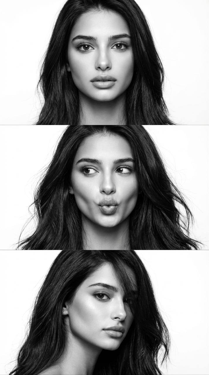 Не меняя внешности женщины с фото, перед нами три крупноформатных чёрно-белых портрета, расположенных вертикальной последовательностью, каждый из которых демонстрирует разнообразие взглядов и эмоций. В верхнем кадре лицо женщины обращено прямо в объектив, глаза широко раскрыты, взгляд спокойный и сосредоточенный, губы слегка приоткрыты, создавая атмосферу задумчивой естественности. Волосы средней длины свободно падают по бокам, текстура их гладкая и шелковистая, хотя отдельные пряди отражают холодный свет, создавая мягкие блики и деликатные тени на лице. Второй кадр захватывает момент игры с выражениями: женщина повернула голову чуть вправо и устремила глаза в противоположном направлении, а губы сложены в странный «рыбий рот», придавая композиции неожиданную и лёгкую игривость. Волосы в этом кадре выглядят более распущенными и живыми, их движения подчёркивают динамичность момента. На третьем портрете голова наклонена слегка вниз и влево, что даёт возможность видеть профиль с подчёркнутым скулом и сильной челюстью. Волосы частично закрывают одну сторону лица, создавая атмосферу лёгкой загадочности и интимности, особенно это подчёркивается контрастом света и тени, который придаёт композиции глубину и тонкость. Вся серия объединена ярким фронтальным освещением с высоким контрастом, характерным для студийной фотосъёмки, при котором лица выглядят объёмными, а текстуры кожи и волос — чётко прорисованными. Отсутствие цвета смещает акцент на формы, линии и эмоциональные нюансы, усиливая выразительность и драматизм образов, благодаря чему фотографии напоминают классические киношные портреты с лаконичной композицией и безупречной визуальной чистотой, фотореалистичное изображение, высокая текстурная детализация, высокое качество, разрешение 8K.
