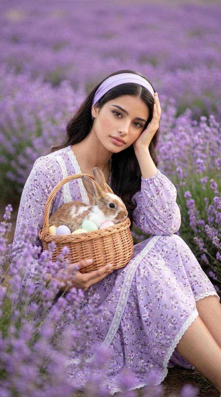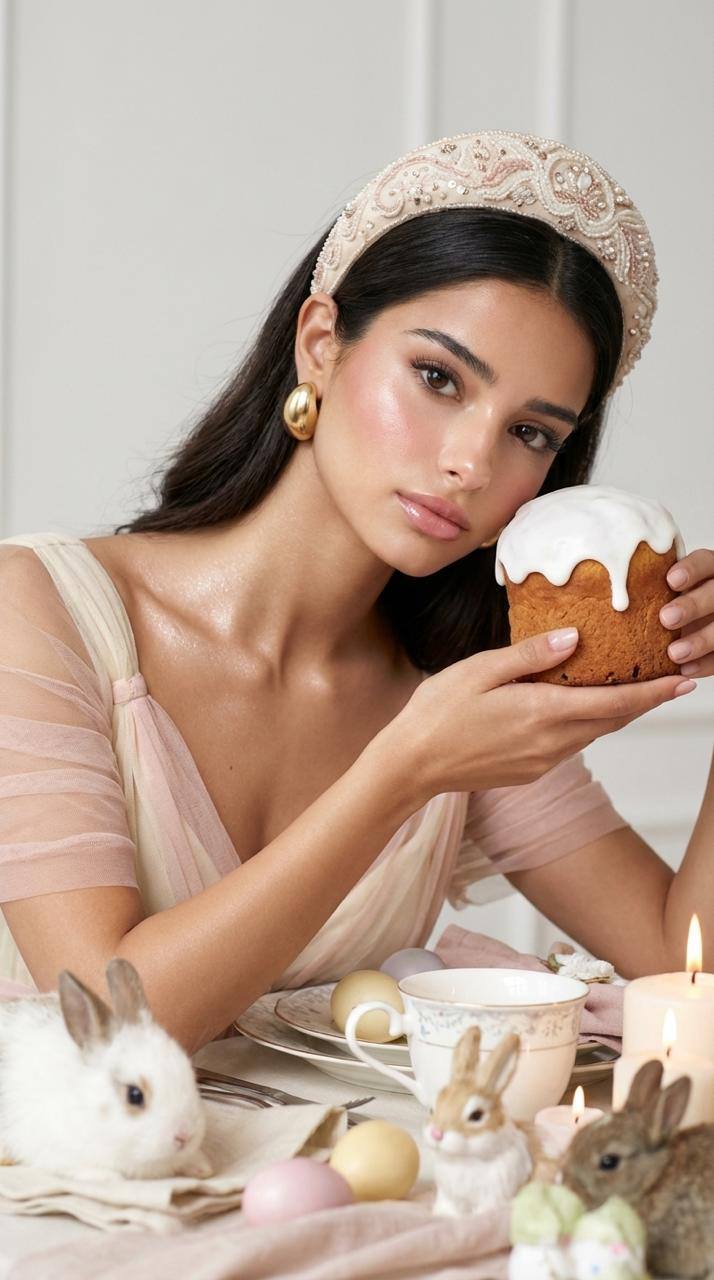 Создай портрет, не меняя черты лица, возраст и волосы. Фотореалистичная живописная цифровая иллюстрация в стиле тёплой семейной открытки к Пасхе, вертикальный портрет 9:16, выполненный в мягких весенних пастельных тонах. Аккуратная цветокоррекция с лёгким film look, мягкий контраст, немного матовые тени, высокая детализация без чрезмерной резкости.
