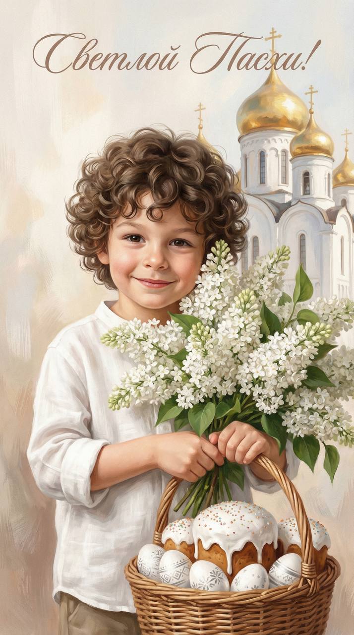 Фон — белый храм с золотыми куполами, с живописной текстурой мазков (как холст/акрил), создаёт уют и глубину. В верхней части кадра каллиграфическая надпись на русском: «Светлой Пасхи!», надпись элегантная в цвет композиции, ровно и читаемо, без дополнительных логотипов. Настроение: домашнее, светлое, праздничное, нежная семейная близость; микродетали: естественная текстура кожи с мягкими поровыми деталями, тонкие морщинки выражения, реалистичные переходы света, аккуратная прорисовка ресниц и бровей, мягкое сияние на губах, чистые цвета без пересветов, 4K качество, высокое разрешение, без артефактов, без посторонних надписей интерфейса, без рамок и элементов телефона.