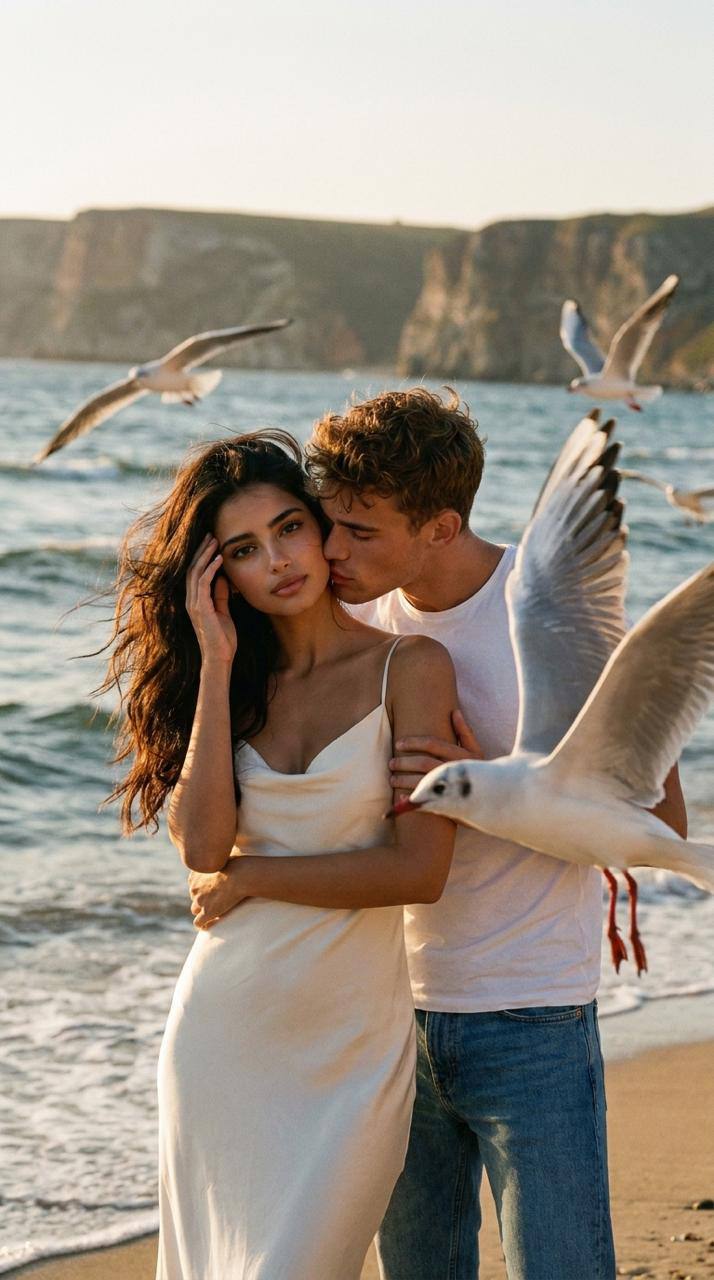 Создай портрет, не меняя черты лица.Глубокий, высококачественный фотопортрет красивой женщины на диком пляже во время золотого часа на закате, снятый при естественном освещении. Женщина слегка волнистыми волосами, слегка растрепанными ветром, стоит вполоборота к камере на песчаном берегу, На ней элегантное, облегающее платье цвета слоновой кости с тонкими бретельками. Правая рука женщины поднята, пальцы нежно касаются волос на виске. Она смотрит прямо в объектив выразительным, спокойным взглядом. Рядом с ней мужчина, на нем белая футболка и голубые джинсы, он целует ее нежно в шею Безупречный макияж, люгубы пудровые с блеском, Вокруг нее летают чайки. В непосредственной близости от нее, на переднем плане справа, запечатлена чайка в полете с широко раскрытыми крыльями, детально видны перья и красные лапки. На заднем плане, над неспокойным морем, летят другие чайки. За морем виднеется высокий обрывистый берег. Мягкое, теплое, золотое свечение заходящего солнца пронизывает всю сцену, создавая длинные тени и подсвечивая волосы женщины и брызги воды. Атмосфера спокойная, естественная, кинематографичная. Фокус резкий на женщине и ближайшей чайке, фон мягко размыт. Приглушенные цвета заката, бирюзовое море, белый снег. Зернистость пленки