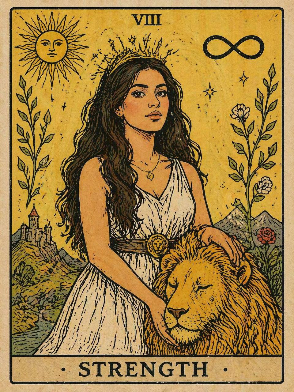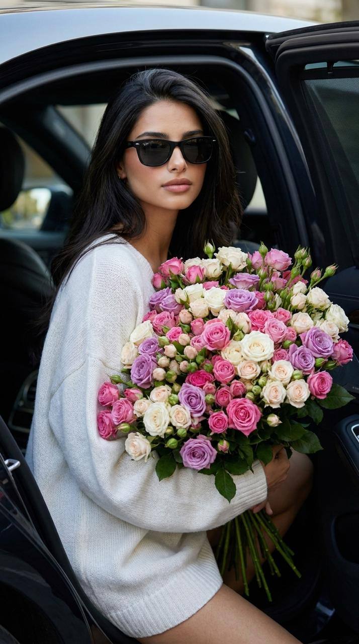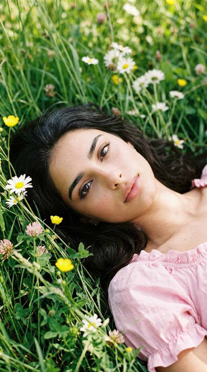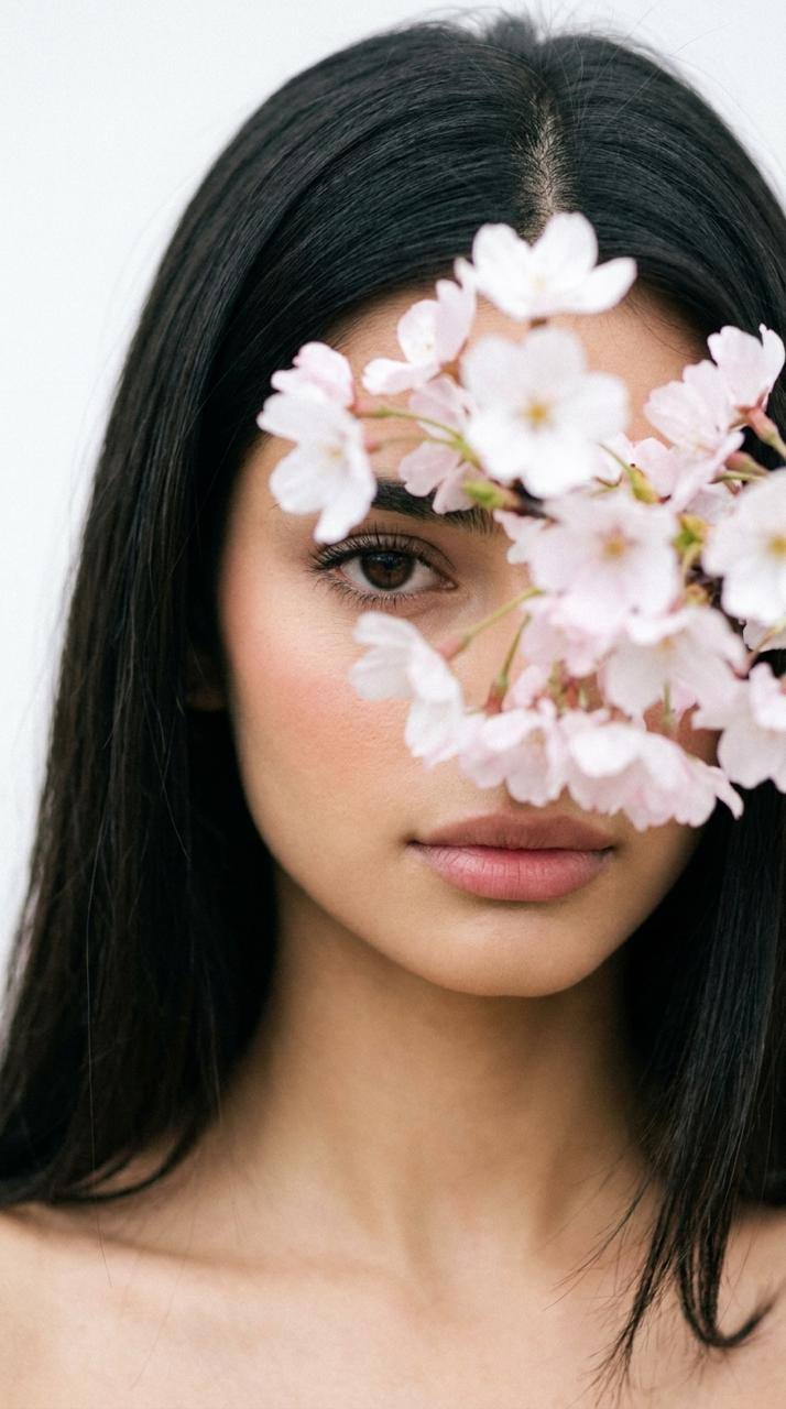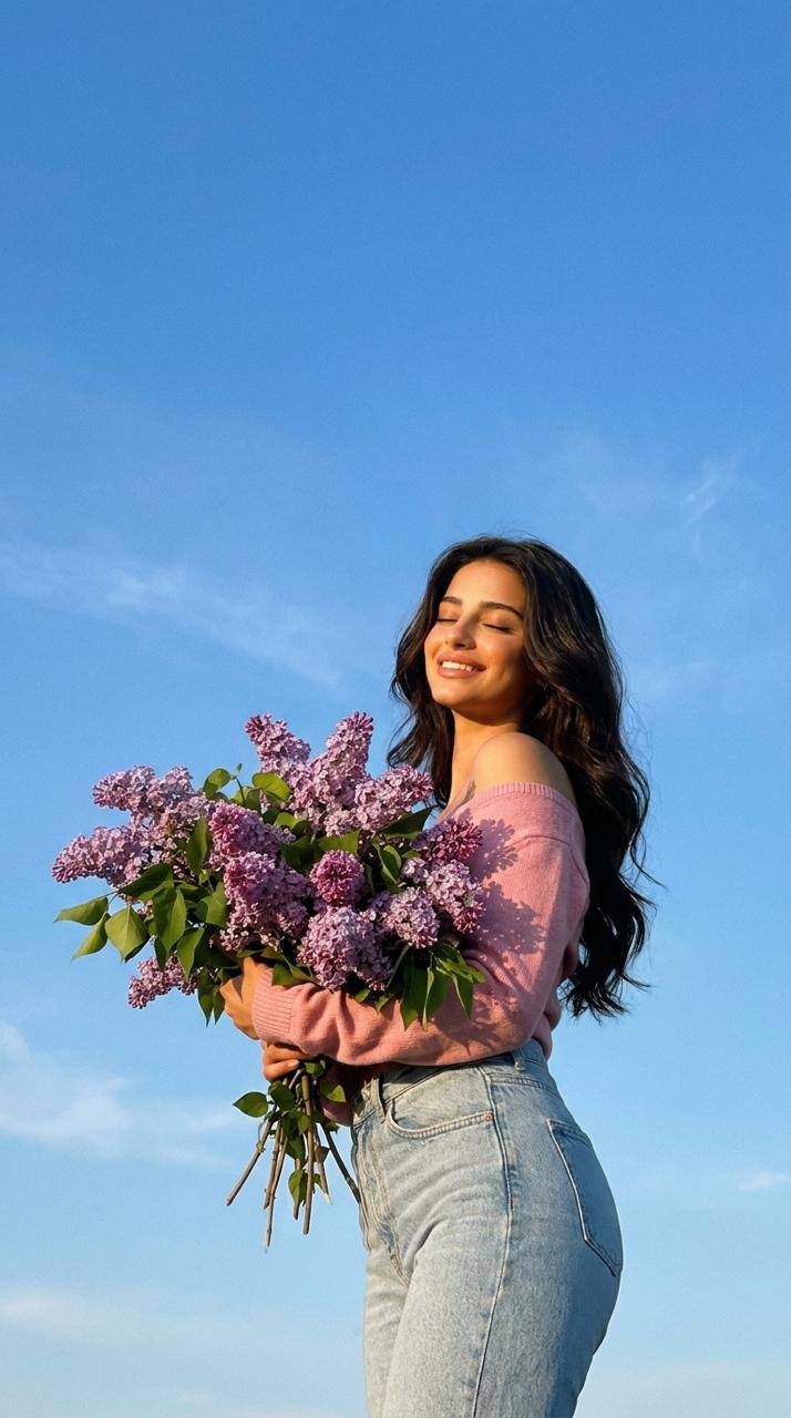 Выражение лица женщины безмятежное, она смотрит немного в сторону или вниз, на цветы. Ее поза расслабленная и грациозная, с легким изгибом в талии, когда она стоит среди цветов. Формат 9:16