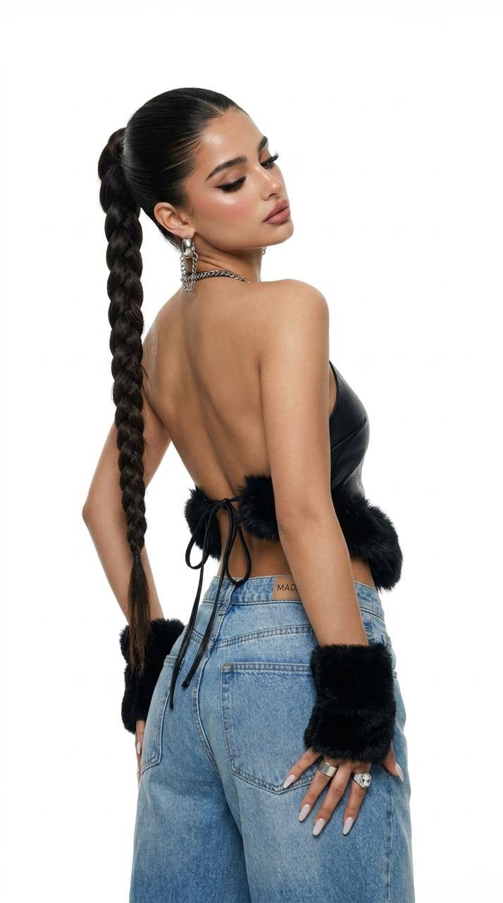 Одежда: На ней надето стильное, оверсайз укороченная кожаная куртка темно коричневая. Обьемные плечи. Фактура кожи должна быть хорошо видна — мягкая, дорогая , с естественными складками. Видны широкий воротник-лацкан и манжет рукава.