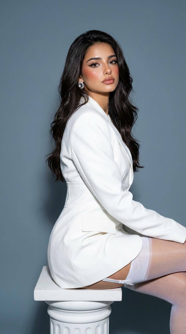 Модный bridal-портрет ракурс чуть чуть сверху, в вертикальном формате: стройная модель сидит на белой ткани, кадр снят немного сверху, верхняя часть тела занимает большую часть изображения. На модели короткое белое кутюрное платье, густо покрытое пайетками, вышивкой, кружевом и объемными цветочными аппликациями, с прямым квадратным вырезом и нежными кружевными деталями на плечах и рукавах. Голову покрывает полупрозрачная белая фата с богато украшенным кружевным фигурным краем, она широко спадает вокруг фигуры и обрамляет лицо как мантилья. На шее кружевной чокер. гладко зачесанные назад волосы с ровным пробором, слегка видимым под фатой, яркие, пронзительные глаза, четкие брови, выраженные скулы, полные губы нюдово-розового оттенка, аккуратный editorial-макияж с мягким скульптурированием и деликатной подводкой. Кожа загорелая, блестит естественным блеском. Выражение спокойное, серьезное, немного отстраненное, взгляд направлен в сторону и чуть из под лба. Жесткий прямой свет вспышки с четкими бликами на коже и ткани, глубокий черный фон, почти все окружение уходит в тень, сильный контраст между ярко-белым платьем и темным фоном. Фата расходится по диагонали и создает драматичный треугольный силуэт. В нижней части кадра видна обнаженная часть бедра, подчеркивающая короткую длину платья. Максимально детализированная фактура кружева, сияющая кожа, ощущение luxury editorial fashion shoot, резкий фокус, реалистичная fashion-фотография, ощущение объектива 50–85 мм, насыщенный контраст, палитра холодного белого, айвори и мягких оттенков кожи на фоне черного. В ушах брильянты.