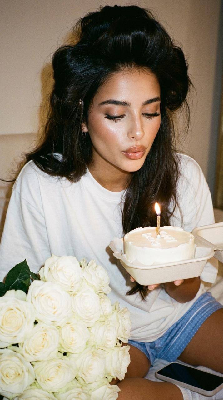 Крупный план , не меняя черты лица. Кинематографичный гиперреалистичный крупный портрет, 8К, как Vogue-кадр. Она сидит расслабленно, нежная улыбка, лицо в полу профиль подбородок слегка касается плеча. На ней струящееся шёлковый удлиненный топ комбинация молочного цвета с кружевом тонких бретельках, ткань мягко обтекает тело, в боковом солнечном свете видны живые складки , и блеск шёлка. На ушах жемчужные серьги . Волосы распущенные отдельные пряди детализированы, одна тонкая прядь пересекает щёку. Жёсткий свет сверху-сбоку, рембрандтовский рисунок: ярко освещённая ближняя