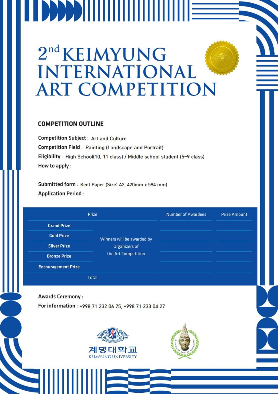 🎨 Академия художеств Узбекистана совместно с Keimyung university (Республика Корея) проводит II Международный творческий конкурс на тему «Искусство и культура».
