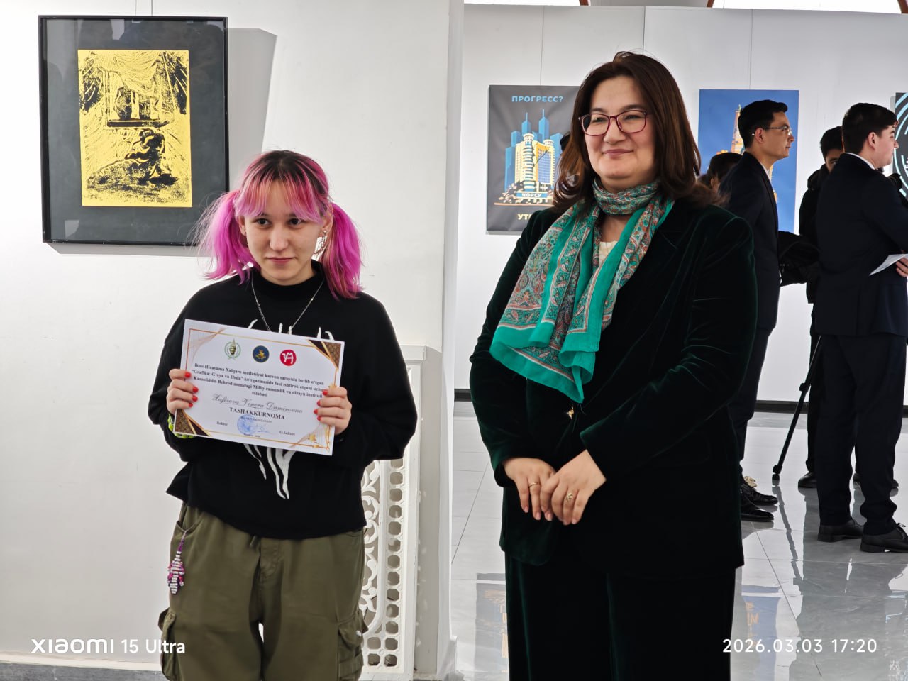 2026 yilning 3 mart kuni soat 17:00da O‘zbekiston Badiiy Akademiyasi Ikuo Xirayama Xalqaro madaniyat karvon saroyining kichik ko’rgazmalar zalida Milliy Rassomlik va dizayn instituti 2 va 3-bosqich talabalarining "GRAFIKA: G'OYA VA IFODA" nomli grafika ko'rgazmasining ochilish marosimi bo‘lib o‘tdi.