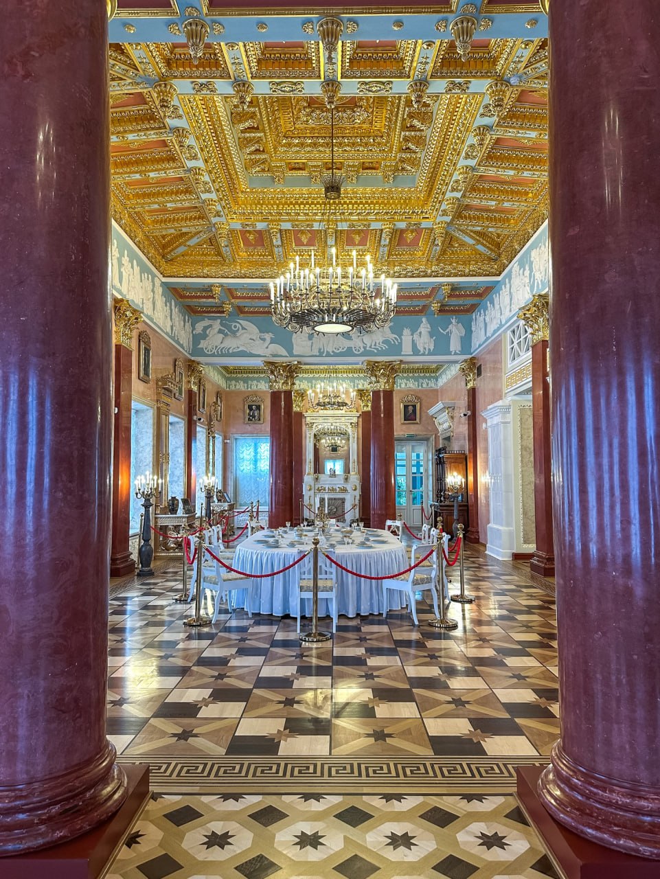 ⚫️Дворец оформлен с помощью лепнины, скульптурной пластики, росписей и фризов. Плафоны украшены сценами из античной мифологии. В залах дворца можно увидеть восстановленные камины и оригинальные потолки, старинную мебель, картины, люстры, зеркала, часы, подсвечники.