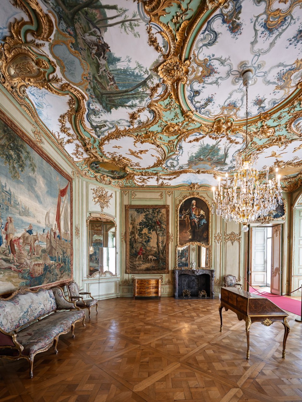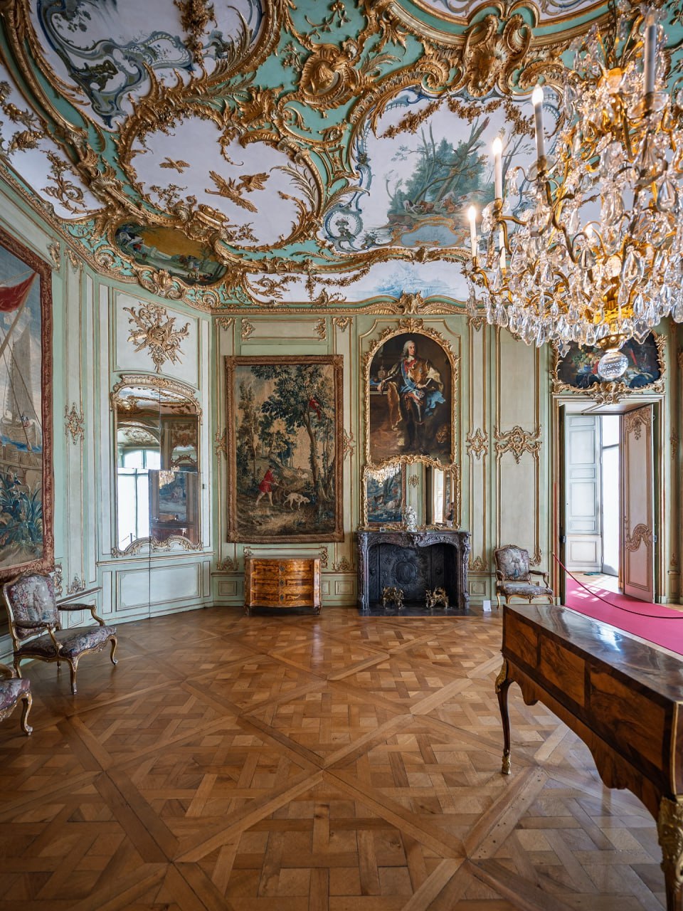 ⚫️Зал для приёмов находится в западном крыле дворца Аугустусбург в городе Брюль. Это один из ранних образцов архитектуры рококо в Германии XVIII века. Расположен внутри высокого и широкого двусветного зального пространства.
