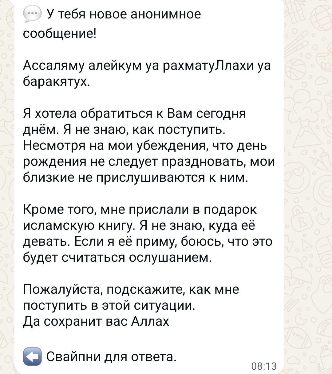 Это так бывает вначале, у меня тоже было так, 2-3-4 раз нужно бывает им это говорить, что вы не можете их брать, что не празднуете такие дни, просто красиво, нормально объясните им, чтобы их не задел ваш отказ, Многие сразу не понимают, поэтому нужно бывает 2-3 раза объяснить с адабом, чтобы вас неправильно ну понял человек который дарит вам подарок. Вы должны границы поставить, до тех пор пока вы это не сделаете, каждый их так будет нарушать.