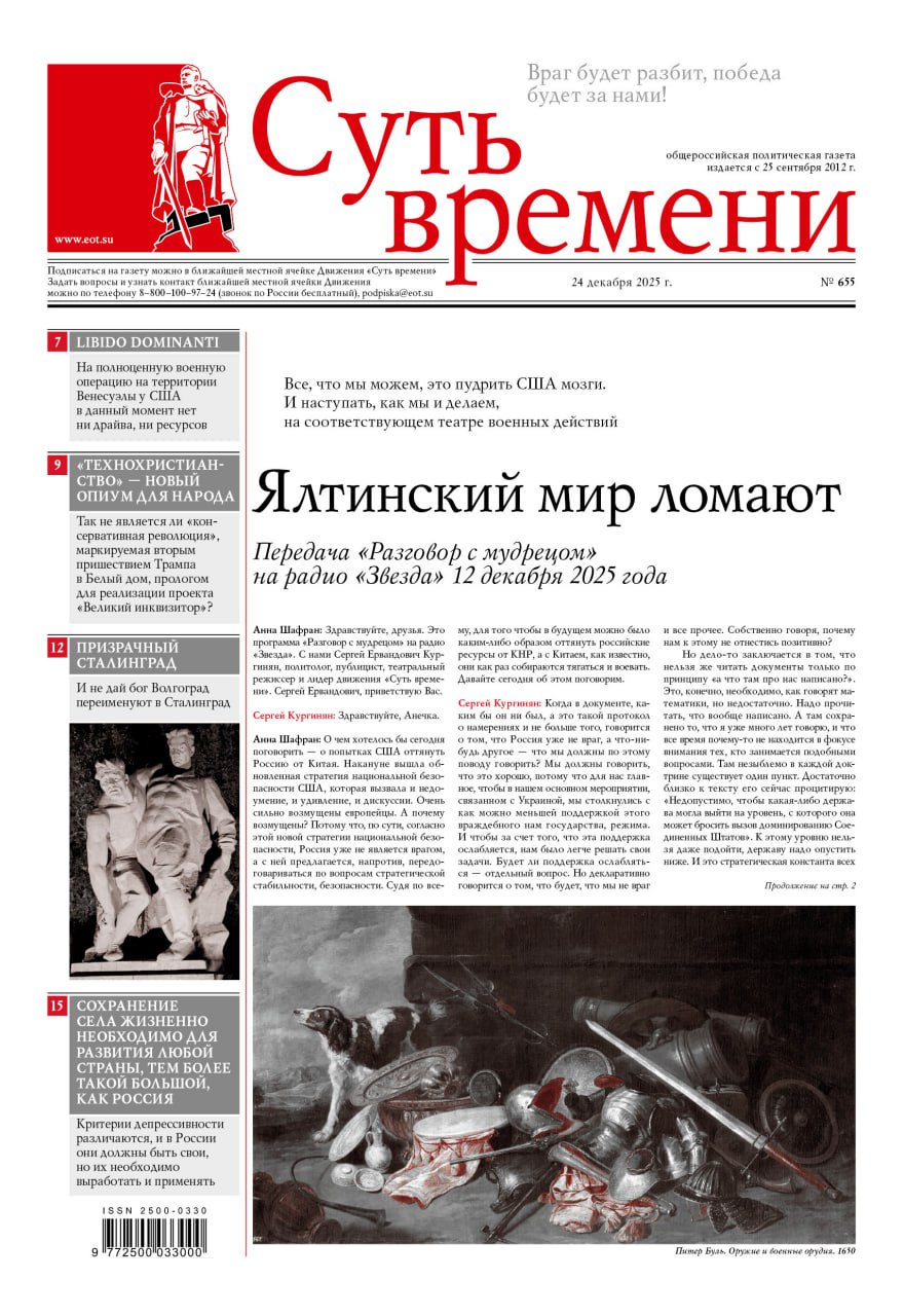 Именно синтез — духа и души, смысла и радости, веры и действия, общественного и личного — лидер «Сути времени» считает необходимым условием выживания в наступающем 2026 году.