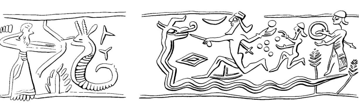 Сцены битв из шумерских табличек: Мардук - верховный бог шумеров сражается с Тиамат - родительницей всего живого.