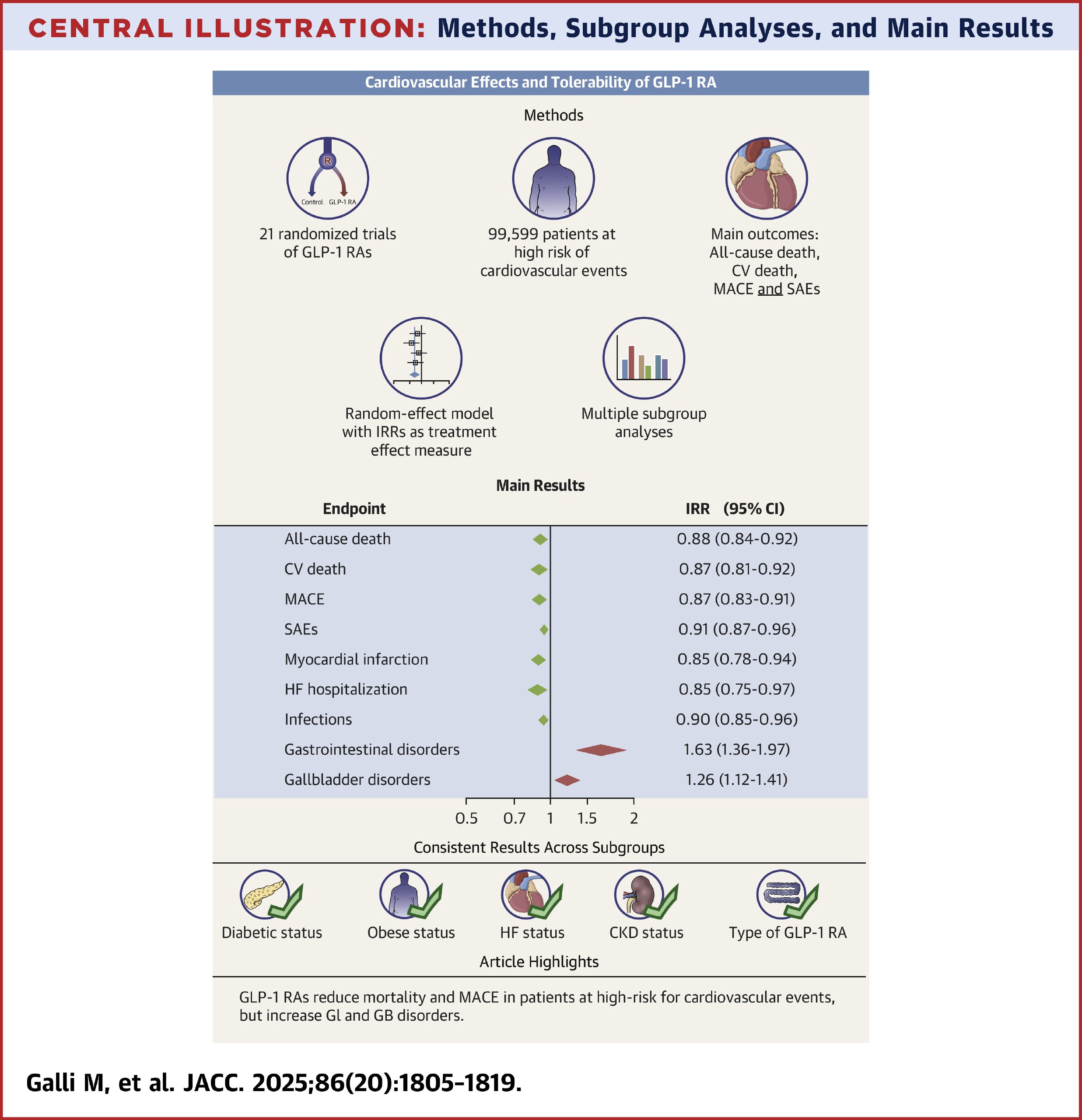 По материалам: Galli, M, Benenati, S, Laudani, C. et al. Cardiovascular Effects and Tolerability of GLP-1 Receptor Agonists: A Systematic Review and Meta-Analysis of 99,599 Patients. JACC. 2025 Nov, 86 (20) 1805–1819. https://www.jacc.org/doi/10.1016/j.jacc.2025.08.027