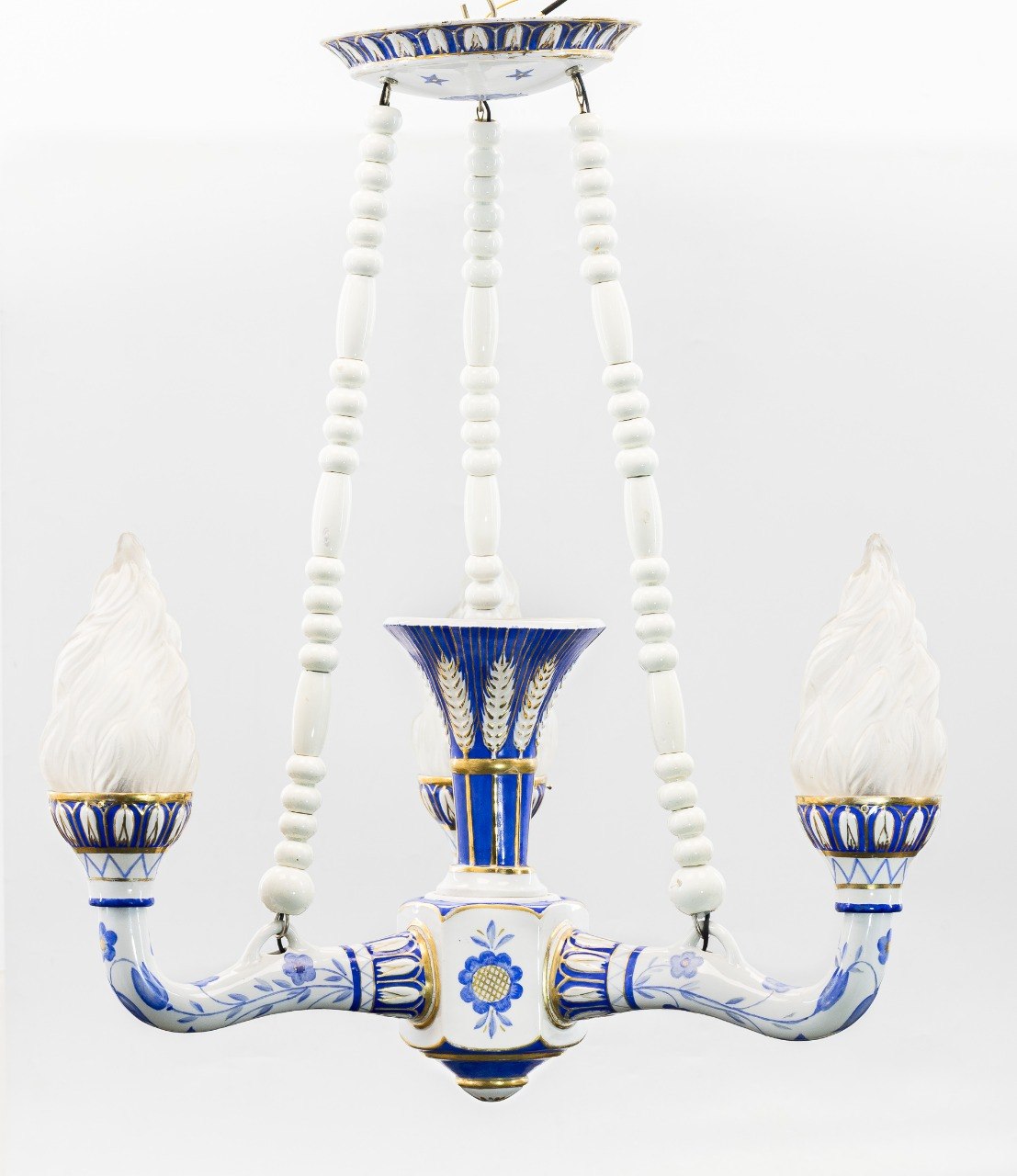 #Фарфор, надглазурная роспись кобальтом, золочение; металлические крепления; матовое стекло плафонов.