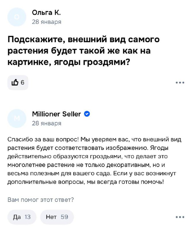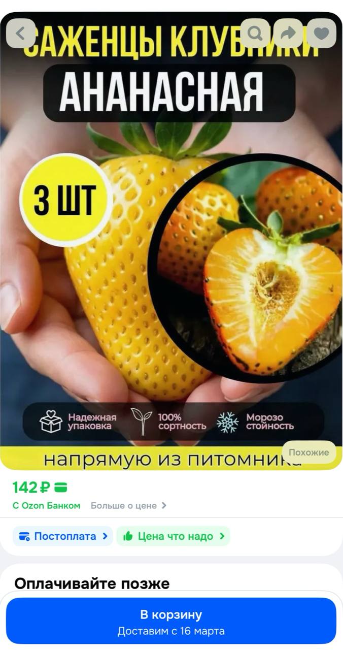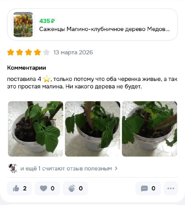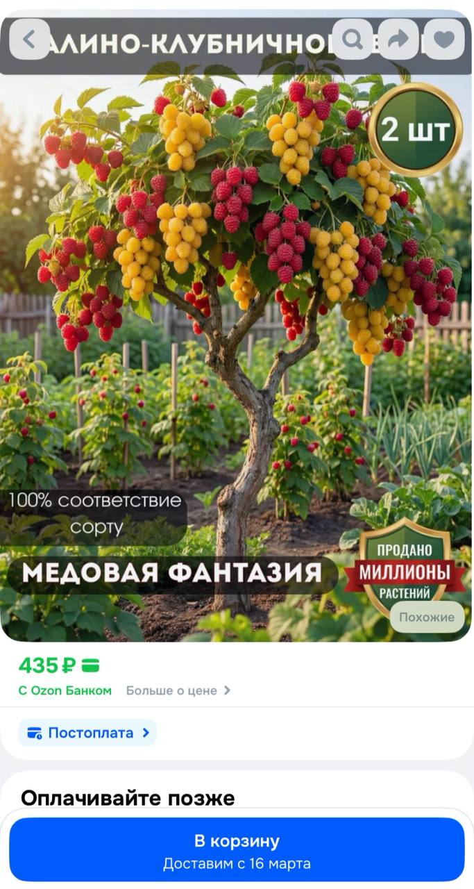 Карточки товаров оформлены яркими ИИ-изображениями, а продавцы называют продукцию «ремонтантными сортами». Наивные дачники оставляют положительные отзывы сразу после получения посылки со словами «саженцы приехали живые», обещая дополнить их после сбора урожая. Но фотографий реальных ягод или фруктов в отзывах нет — вырастить из этих саженцев что-то, кроме обычных растений, невозможно.