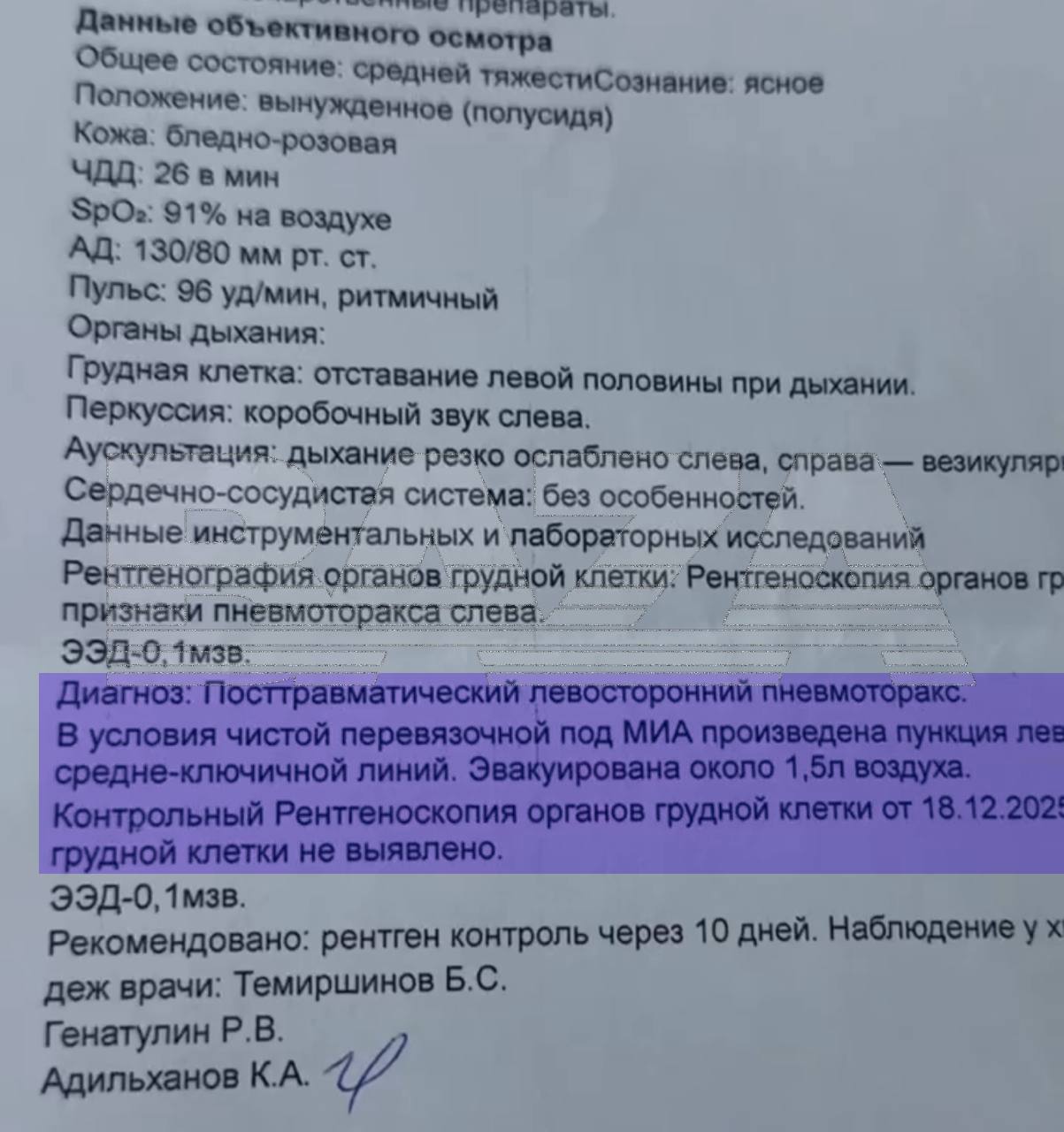 Как рассказала «Базе» дочь Галины, на следующий день её матери стало хуже. Сотрудники санатория предполагали, что у неё проблемы с сердцем, вызвали скорую, но во время осмотра никто из них не сказал, что накануне у женщины была процедура иглоукалывания. Прибывшие медики исключили инфаркт, рекомендовали Галине ехать домой и обращаться в областную больницу по прописке. Она вернулась в Усть-Каменогорск, вызвала скорую, и на рентгене выяснилось — у женщины проткнуто лёгкое и начался пневмоторакс.