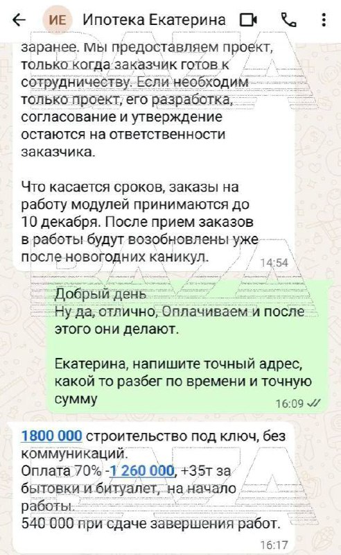 Однако за три месяца стройка так и не началась. Екатерина находила разные объяснения и оправдания. По её словам: то со строителями невозможно связаться из-за кнопочных телефонов, то в лесу не ловит связь, то якобы у них недавно сгорел дом, поэтому они вынуждены сначала возводить новое жильё за свой счёт и «пилить окна под нужный размер».