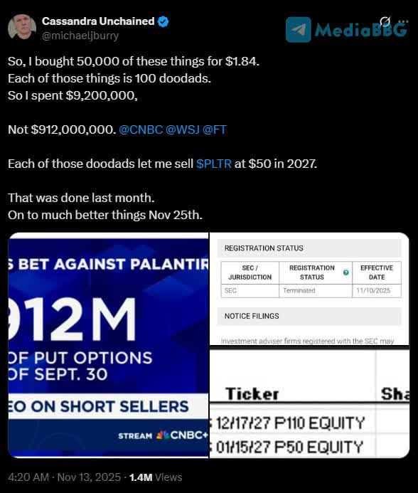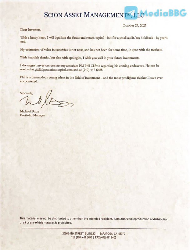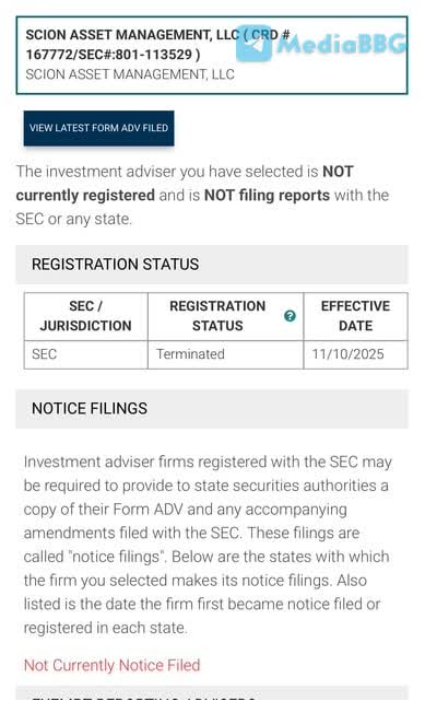 ❗️🇺🇸 Майкл Бьюрри официально закрыл свой фонд Scion Asset Management, объяснив это тем, что его взгляд на рынок «давно перестал совпадать с реальностью».