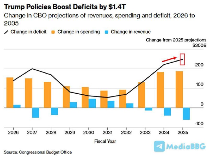 🤍Бюджетное управление Конгресса (CBO) прогнозирует, что дефициты бюджета США вырастут еще на $1,4 трлн в течение следующих 10 лет.