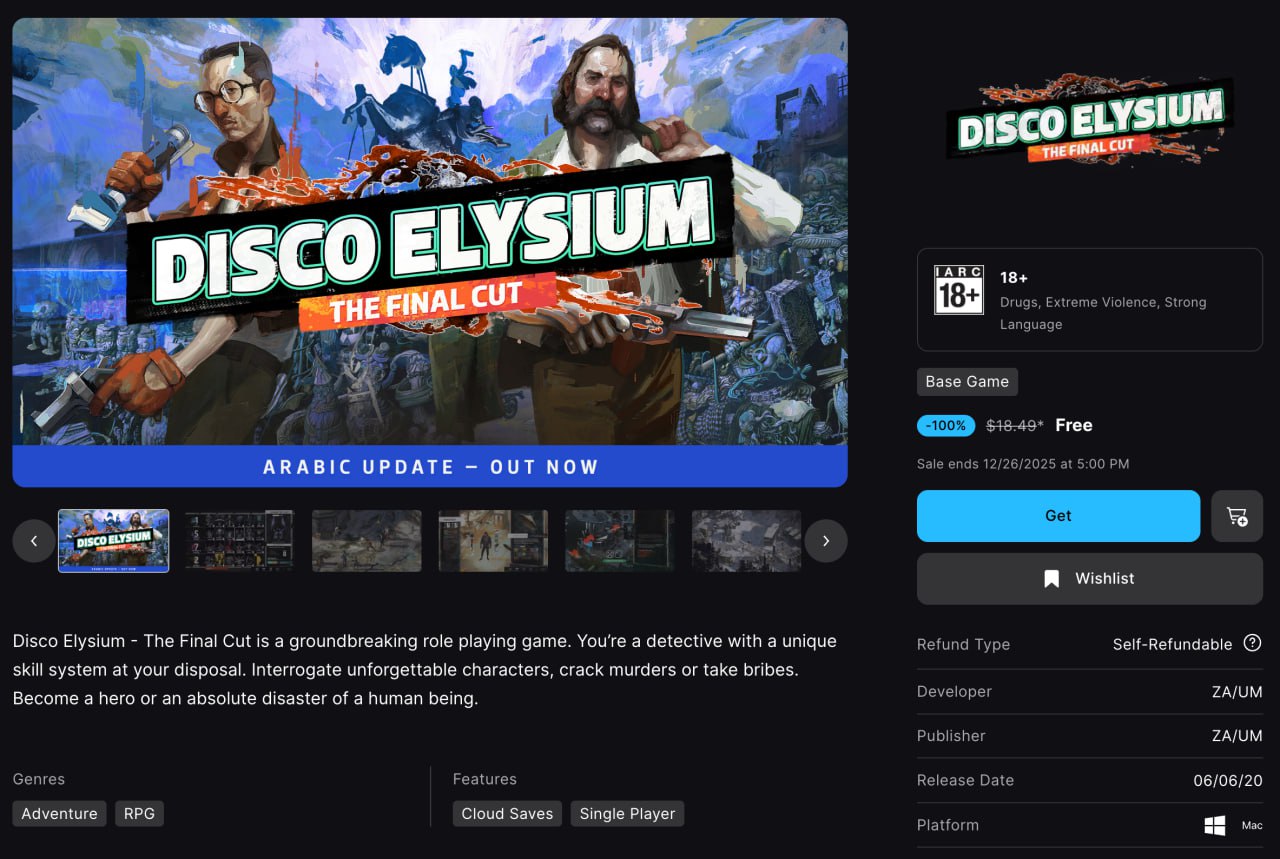 В EGS стартовала раздача легендарной детективной RPG — Disco Elysium.