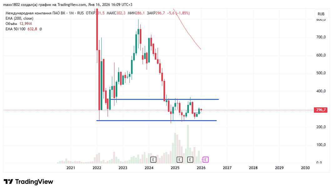 🔵С технической точки зрения акции СПБ Биржи в конце 2025 года предприняли очередную попытку восстановления от локальных минимумов, но не смогли вернуться к пику августа 300,50 руб, оказавшись под давлением геополитической неопределенности. С марта 2025 года котировки при этом формируют фигуру «симметричный треугольник», что указывает на отсутствие четкого среднесрочного направления движения.