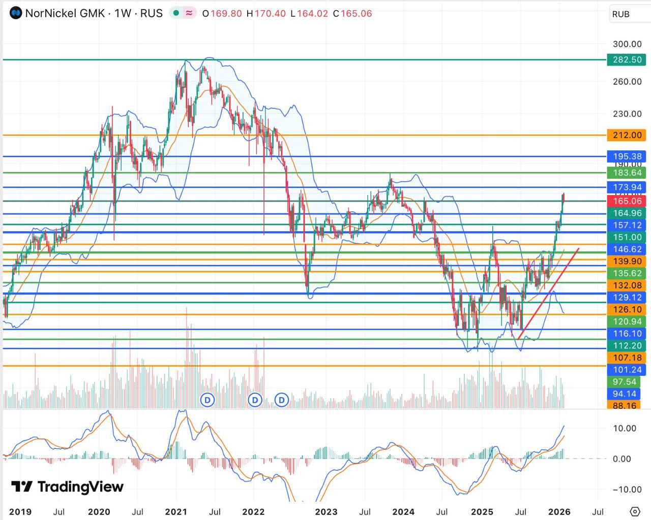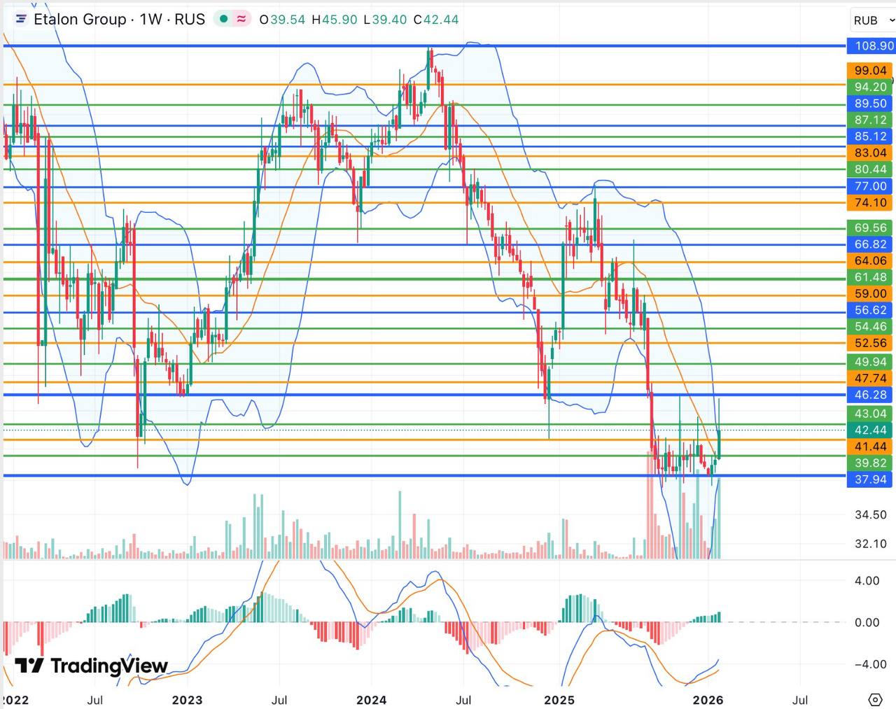 📊С технической точки зрения акции Эталона, который в 2025 году завершил редомициляцию, утром понедельника в том числе на фоне публикации годовых операционных результатов подскакивали до 45,90 руб – максимума с ноября 2025 года, после чего отступили ниже. Котировки с сентября прошлого года преимущественно пребывали в рамках диапазона 38-43 руб, из которого попытались выйти наверх в том числе сегодня. Гистограмма и линии MACDдневного и недельного графиков при этом дают преимущественно позитивные сигналы и перешли к росту, не исключая дальнейшего повышения бумаг.