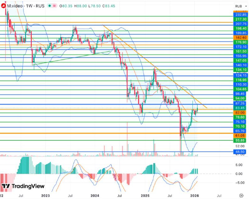 📊С технической точки зрения акции М. Видео с октября 2025 года продолжают восстановление от минимума с 2009 года 55,95 руб и все ближе подходят к линии долгосрочного нисходящего тренда, расположенной у 87 руб. Показания дневного и недельного графиков при этом умеренно позитивны (гистограмма и линии MACDпытаются развить рост) и не исключают дальнейшего восходящего движения. Котировкам, однако, еще предстоит обновить пик декабря прошлого года 91,50 руб и стабилизироваться выше, что может открыть перед бумагами новые горизонты повышения.