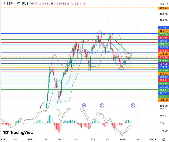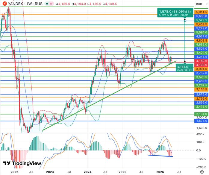 Акции сформировали ложный пробой нижней границы канала и вернулись внутрь диапазона, что подтвердило слом нисходящего тренда и возобновление покупательского давления. При объеме позиции в 6% и выставлении стоп-заявки на уровне 4172,00 руб., риск на портфель составит 0,35%. Соотношение прибыль/риск составляет 2,13.