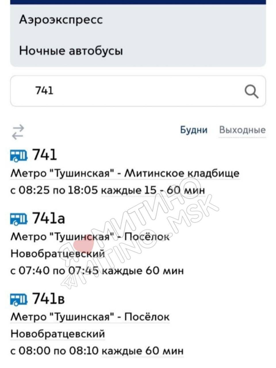 Теперь еще один маршрут, по которому можно было доехать до м. Тушинская утром и вернуться в Митино вечером, исчез. На картах его не найти. Есть только 741, который работает после 9:00. На официальном сайте МОСГОРТРАНС его также больше нет (фото №2).