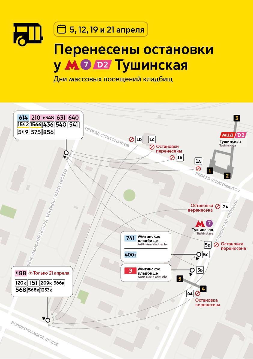 Изменится режим работы и трассы некоторых автобусов и электробусов. Остановки у станции «Тушинская» временно перенесены.