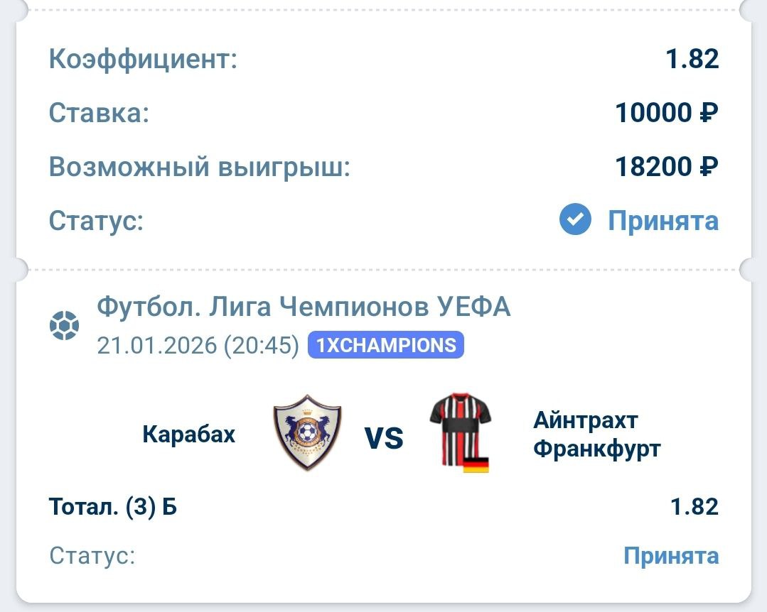 ☑️ В трех последних матчах Карабаха, забито ни менее четырех голов. Такая же статистика у Айнтрахта, в трех последних матчах, забито ни меньше пяти голов.