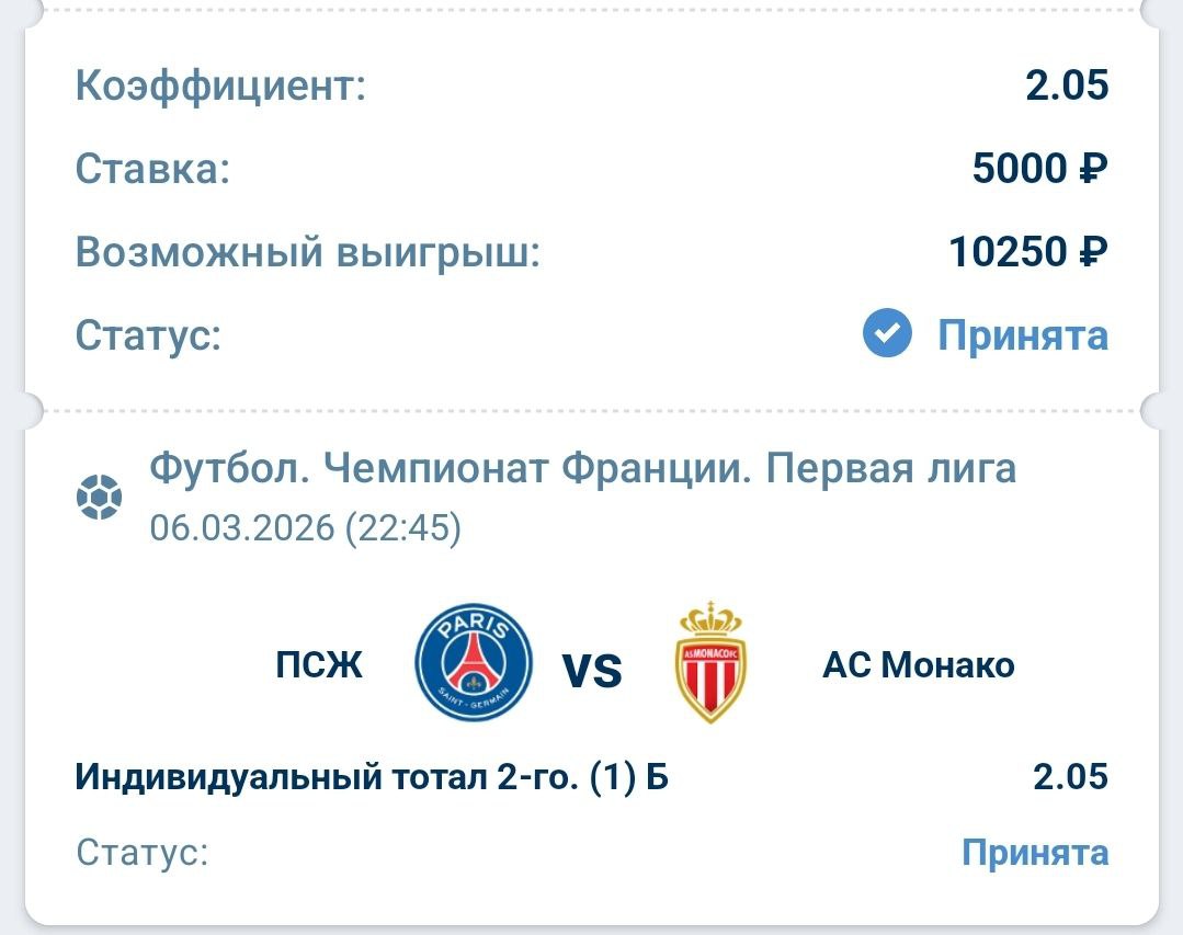 ✅ Прогноз: инд.тотал Монако, больше 1 гола.