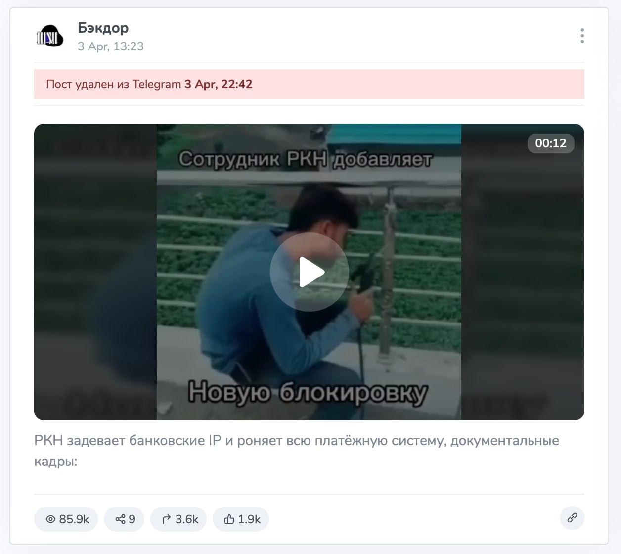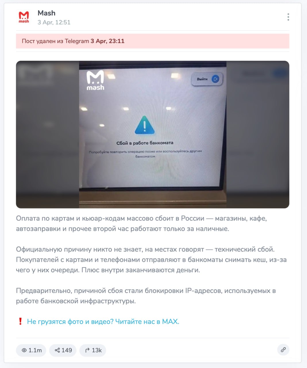 Обе новости подхватили несколько крупных телеграм-каналов, в том числе «Двач». Позже канал заявил, что РКН потребовал от них удалить информацию (пост уже удален) о связи сбоев в работе банков и блокировок, и опубликовал соответствующий документ РКН.