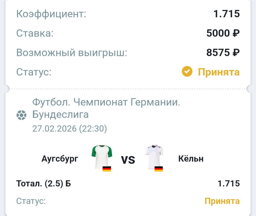 В пяти турах с 24 января «Аугсбург» набрал 12 очков — круче на этом отрезке в Бундеслиге сыграла только «Боруссия» (13). Топ-рывок команды Баума начался с выездной победы над «Баварией» (2:1), а на прошлых выходных она разобралась в гостях с кризисным «Вольфсбургом» (3:2), накопив за 90 минут 1,79 xG и нанеся 15 ударов. В восьми играх 2026 года у баварцев пять раз прошёл ТБ 2,5. После возвращения в Бундеслигу «Кёльн» стабильно радует нейтральных болельщиков яркими матчами. Да, в 2026 году «козлы» набрали только восемь очков из 24 возможных, зато в их встречах 3+ мяча забивались в семи из восьми случаев. В трёх выездных матчах с начала года «Кёльн» каждый раз пропускал не менее двух голов. «Аугсбургу» на руку слабая оборона «козлов», но у тех лучшая атака нижней половины таблицы Бундеслиги.