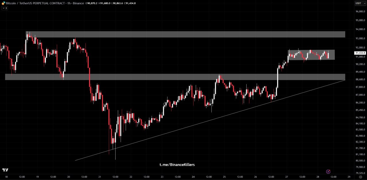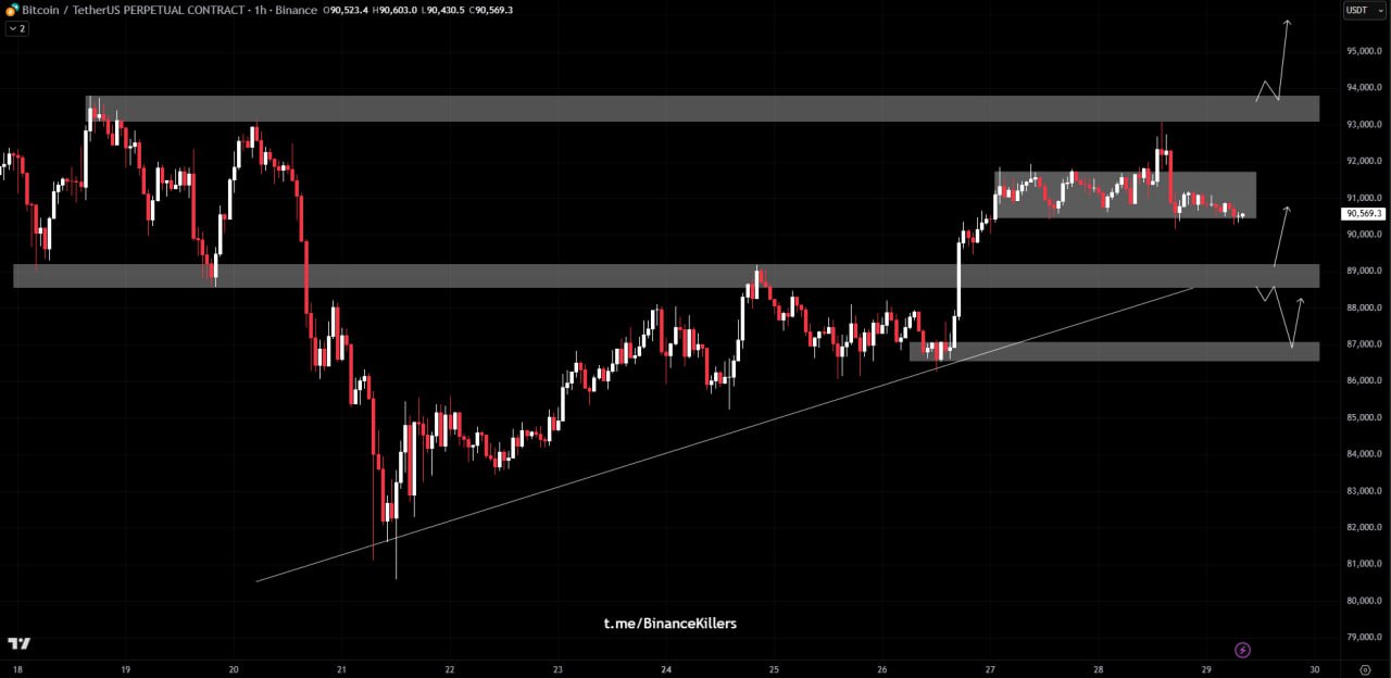 As long as price holds above the mid-range support around $90K, this structure remains a healthy pause within the uptrend. A breakout above the range could trigger a move toward the upper resistance zone near $96K, where the next reaction zone sits.
