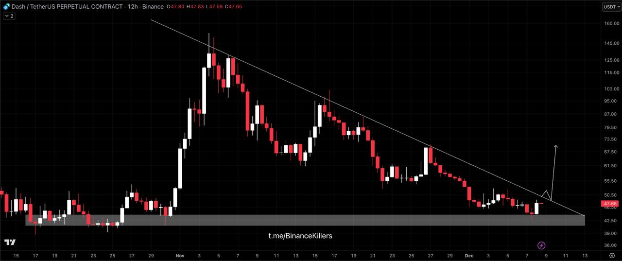 Dash is holding strongly above the major demand zone, showing signs of a potential short-term reversal. Price is also approaching the long-term descending trendline, which has consistently acted as resistance.