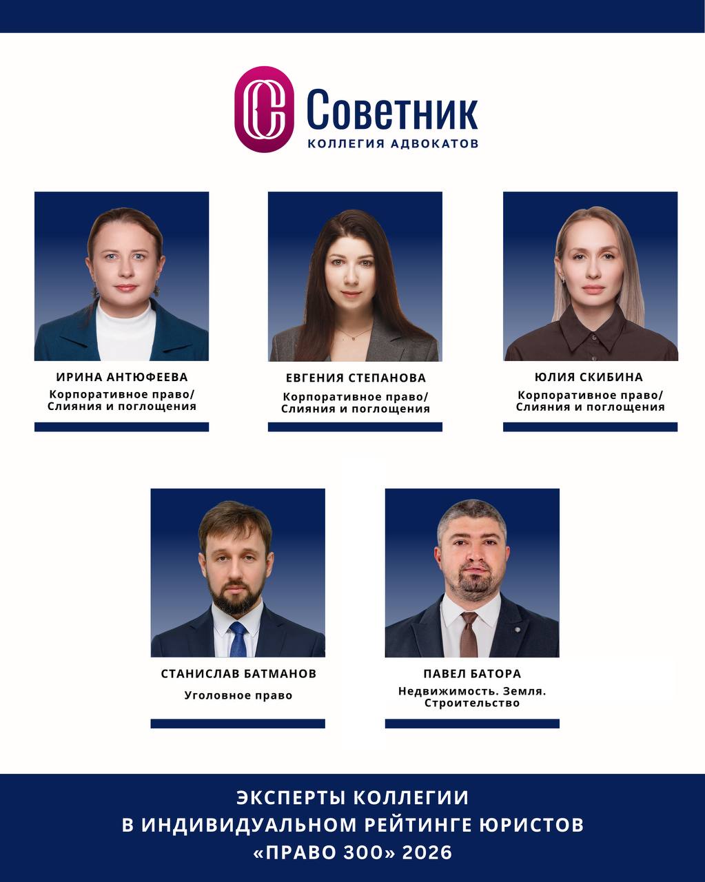 Опубликованы результаты индивидуального рейтинга юристов «Право-300». В этом году пять профессионалов коллегии – Ирина Антюфеева, Евгения Степанова, Юлия Скибина, Станислав Батманов и Павел Батора – вошли в индивидуальный рейтинг «Право-300» в номинациях «Корпоративное право/Слияния и поглощения», «Уголовное право», «Недвижимость. Земля. Строительство».