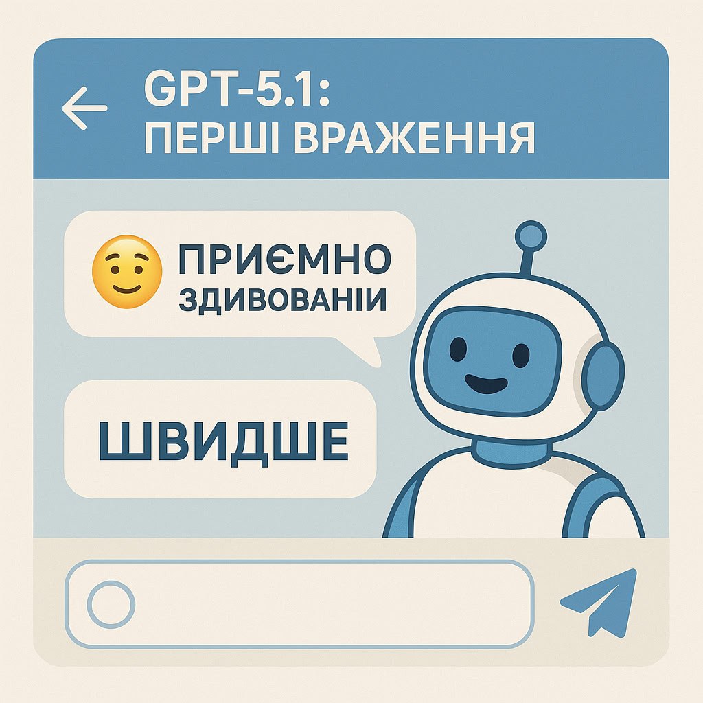 Для мене GPT-5.1 — це про те, що щоденна робота з моделлю стала комфортнішою: швидше отримую відповідь, легше її читати, менше бажання щось "переписати по-нормальному". Цей текст я написав сам, а відредагувала й підчистила його якраз GPT-5.1.