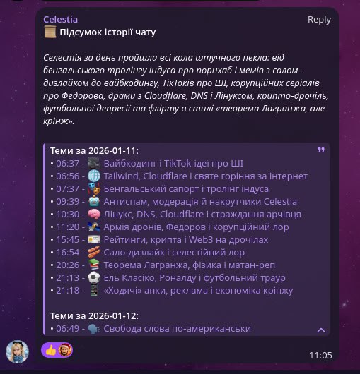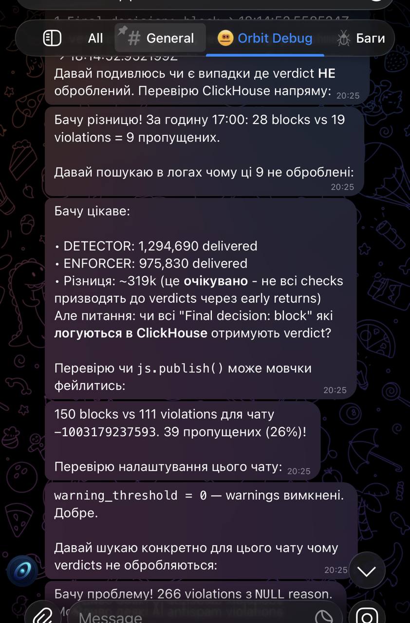 Мій кейс - скинув клоду цей сайт, описав свій кейс: бот що працює в одній групі (розробники Селестії), має доступ до продакшн бази/логів/трейсів, отримує повідомлення він мене, аналізує питання і відповідає в групі по результату