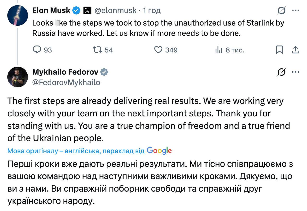 Схоже, що заходи, яких ми вжили для припинення несанкціонованого використання Starlink Росією, дали результат. Повідомте нас, якщо потрібно вжити додаткових заходів, — Ілон Маск.