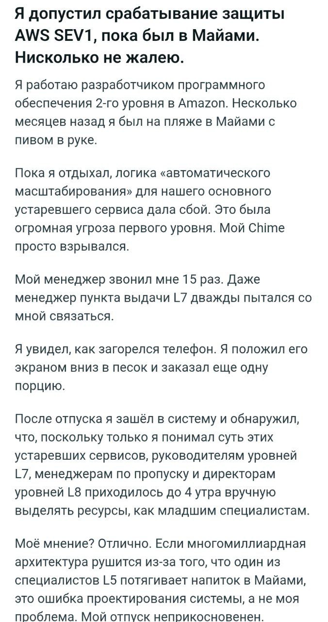 ОР: гениальный инженер из Amazon научил высший менеджмент ценить работяг — во время его отпуска в Майами ключевой легаси-сервис РУХНУЛ с критической ошибкой SEV1.
