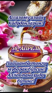 ⭐️БУГУН 16 ➖ АПРЕЛЬ. ПАЙШАНБА КУНИНГИЗ МУБОРАК БЎЛСИН АЗИЗЛАР!🌺 🕊️🌺
