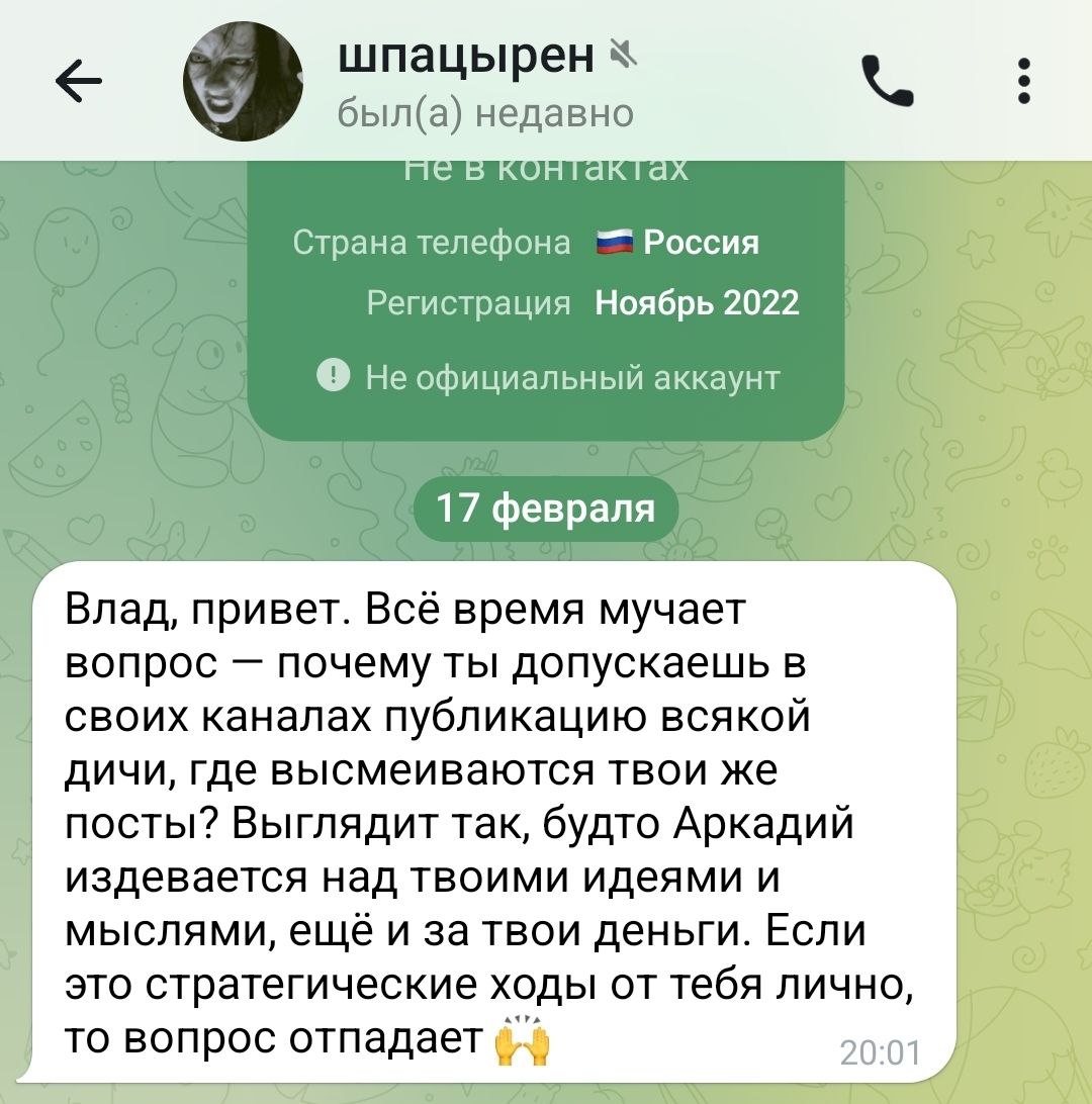 Даже недавно пост от аркадия где он типо разъебал ркн это мой пост был. А все ставили слонов аркадию типо ух.бля слон не то что пацняк. А я сидел и орал . А потом реплаем кинул кружок в котором сказал что не согласен с аркадием, то есть я не согласен сам с собой, и снова сидел орал с гоев в комах. Так как у акакия в тот день был вообще выходной короче идите нахуй