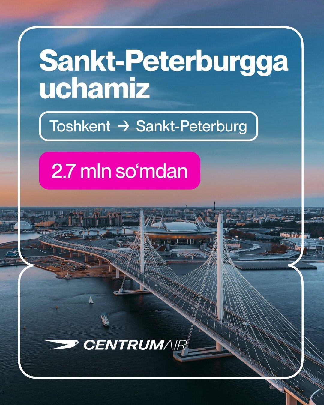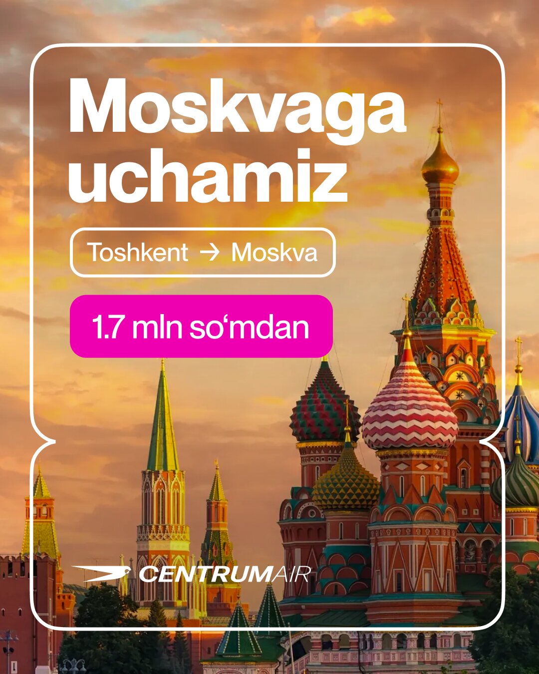❤️ Centrum Air Toshkentdan Moskvaga 1,7 mln so'mdan boshlangan narxlarda muntazam reyslarni amalga oshiradi.