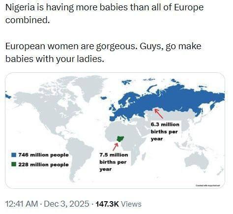 В одной Нигерии за год родилось больше детей, чем в Европе и России вместе взятых (данные за 2023): Нигерия Население – 228 млн.чел. Родилось – 7.5 млн.детей Европа + Россия Население – 746 млн.чел. Родилось – 6.3 млн.детей Предложить новость / Мы в Max / Мы в ТГ / Мы в ВК