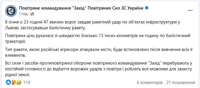 🇷🇺💥🇺🇦Баллистическая ракета, атаковавшая Львовскую область, неслась со скоростью 13 000 км в час, — Военно-воздушное командование ВСУ "Запад" Предложить новость / Мы в Max / Мы в ТГ / Мы в ВК